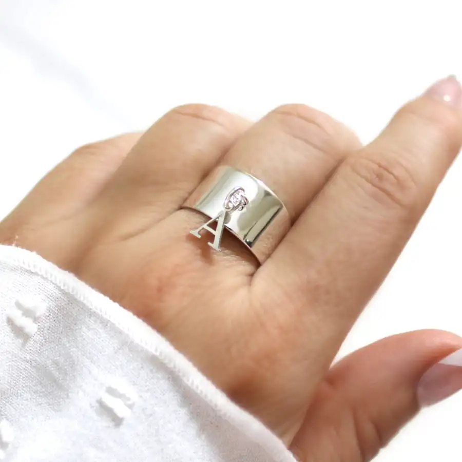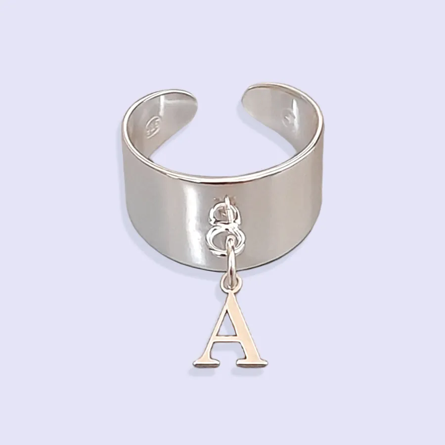 Bague ARGENT INITIALE, redimensionnable, décorée d’une breloque initiale (lettre ciselée).