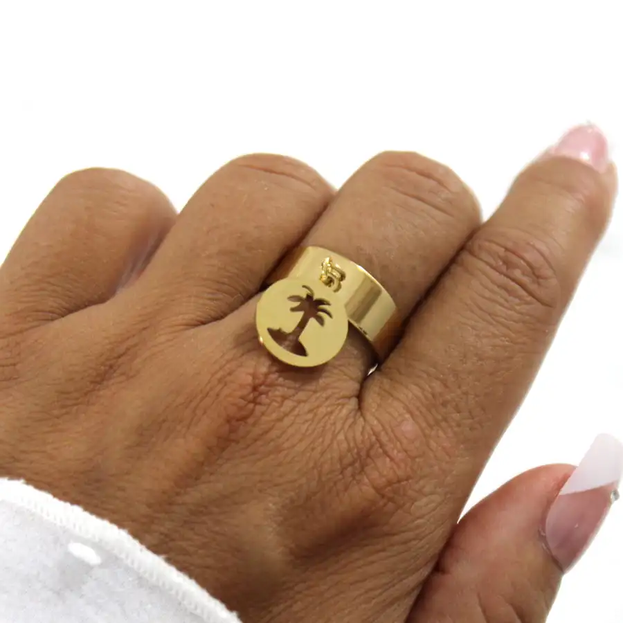 La Bague Breloque MÉDAILLE PALMIER ACIER INOXYDABLE est ouverte et ajustable. Elle peut donc s’adapter aux tailles de doigts les plus courantes (de la taille 50 à la taille 60).