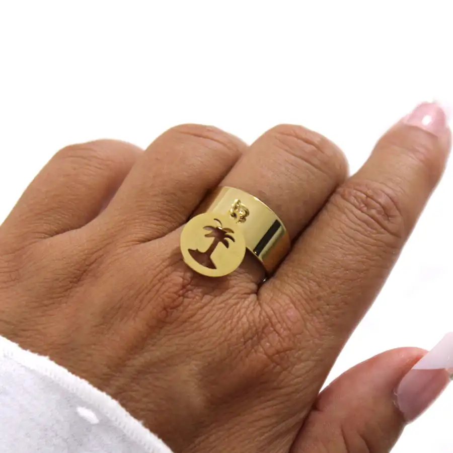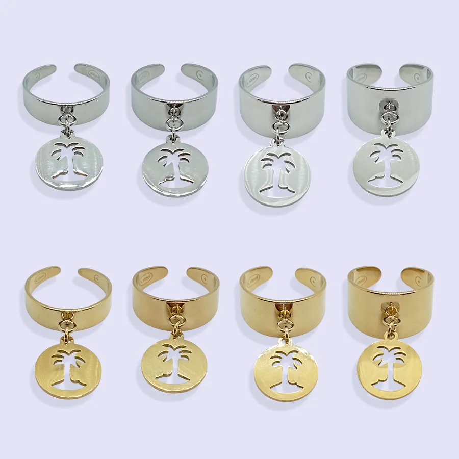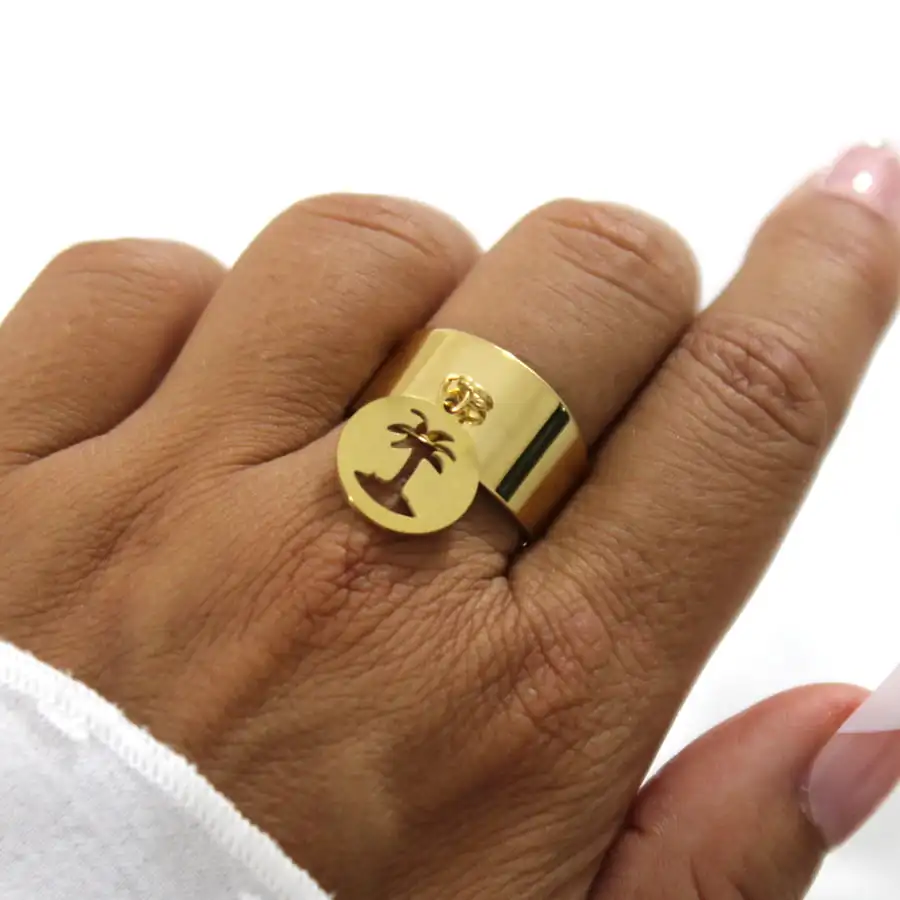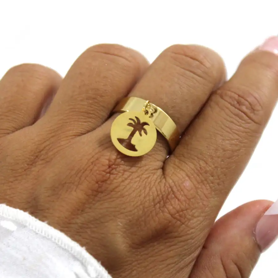 Bague Breloque MÉDAILLE PALMIER ACIER INOXYDABLE, bague redimensionnable en acier inoxydable doré ou argenté, breloque en forme de médaille avec découpe palmier.