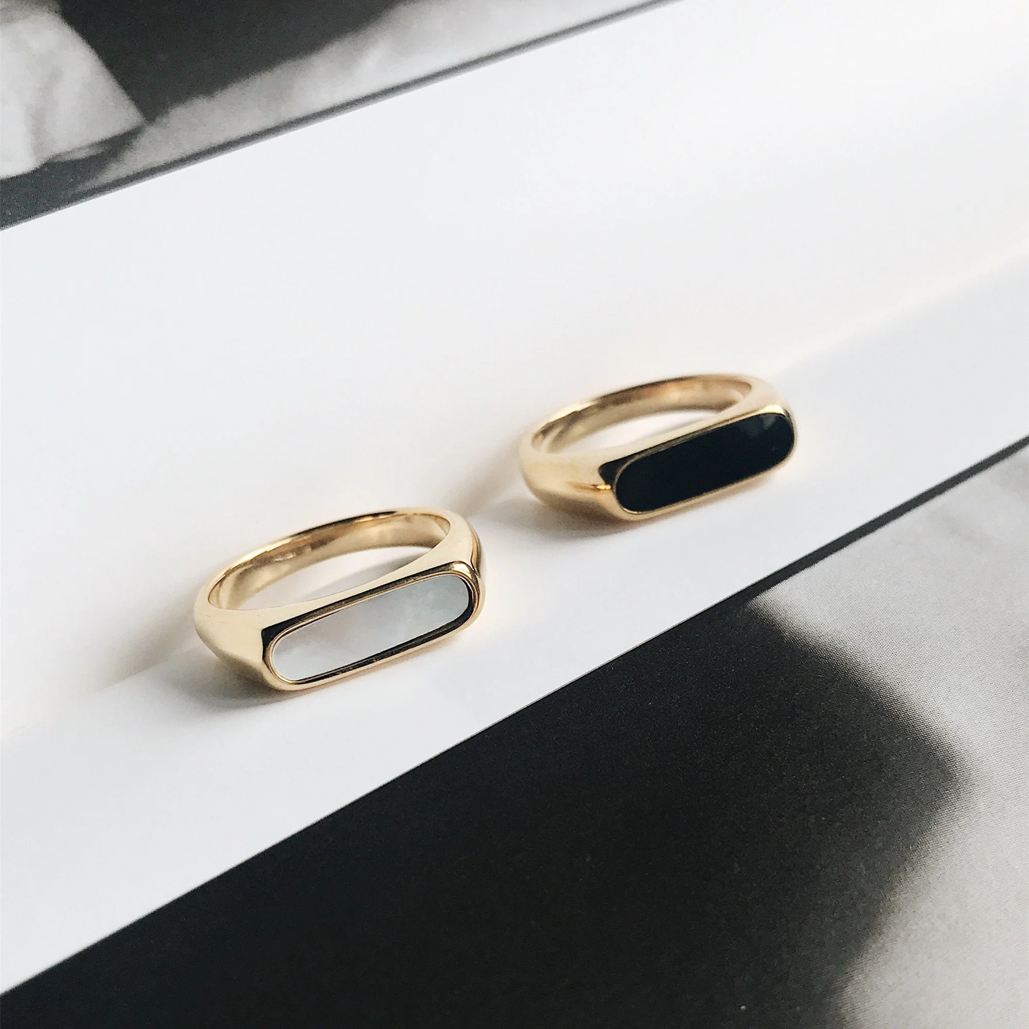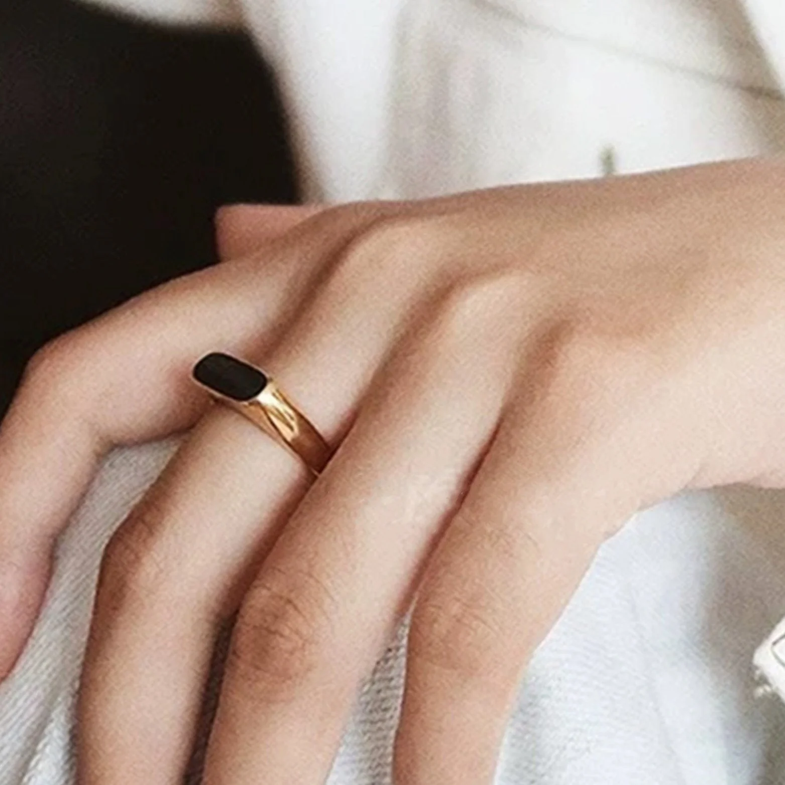 Cette bague chevalier rectangle serti nacre ou en émail noir est en acier inoxydable plaqué or. Élégante et bohème, elle est idéale en superposition avec des bagues plus fines et/ou serties, afin de créer un look différent chaque jour !