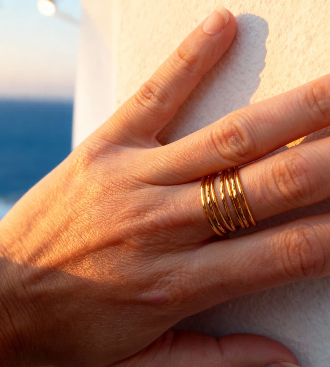 Anneau ouvert au fini doré, dessiné par une succession de fines lignes comme des vagues de la mer Égée. Effet multi-rangs, léger et graphique. Taille ajustable pour un confort quotidien, à porter seule en statement ou en stacking avec vos autres anneaux de la collection.