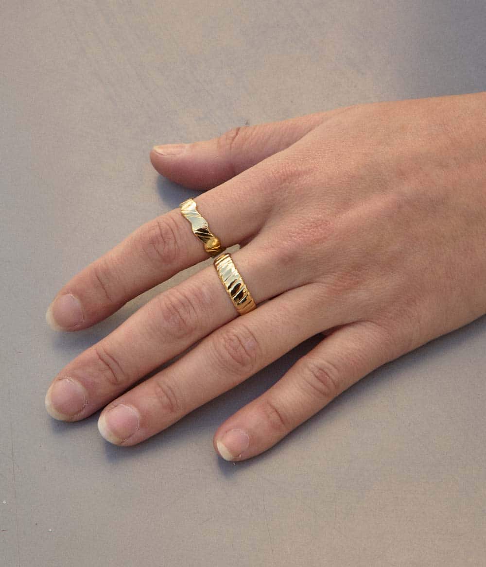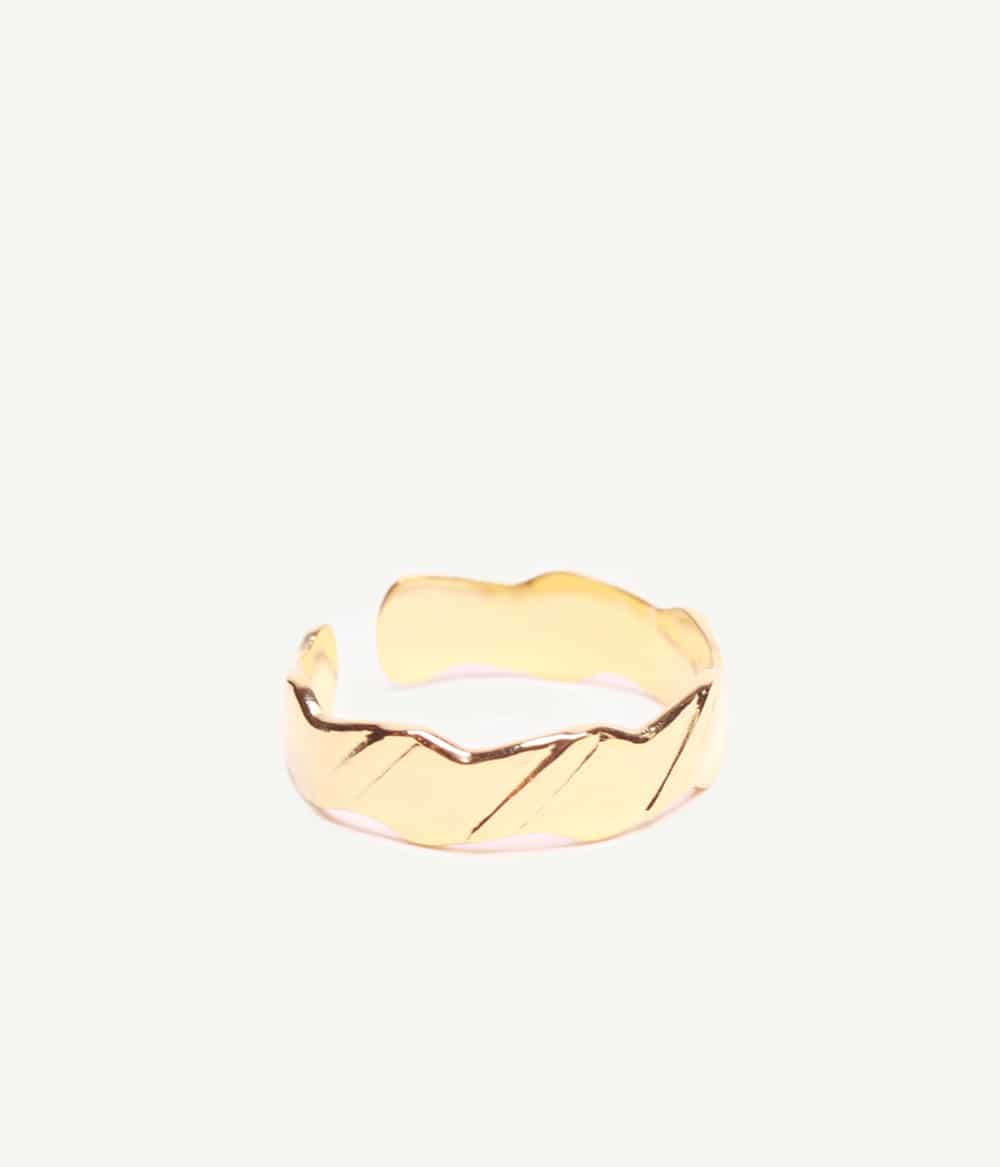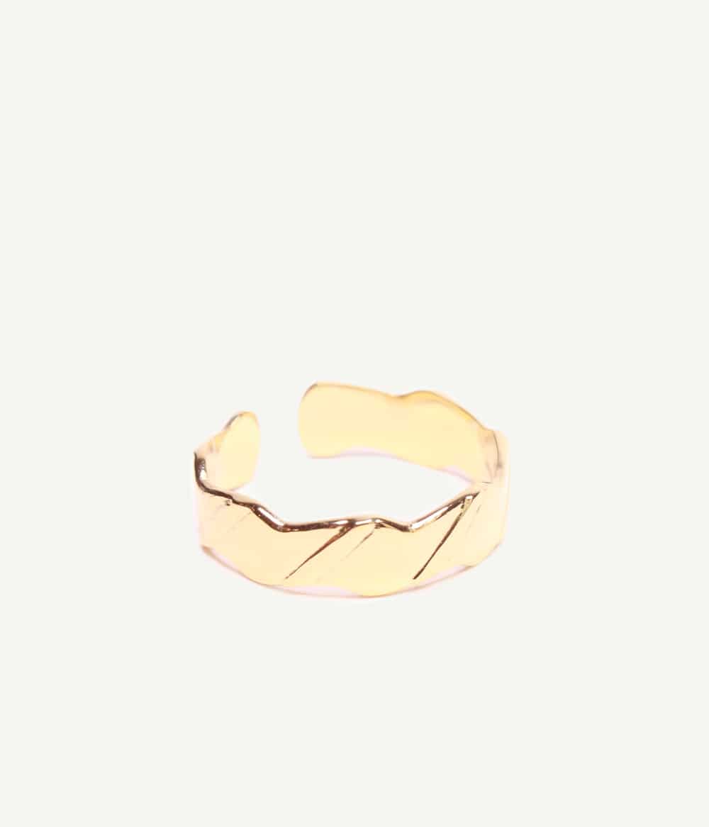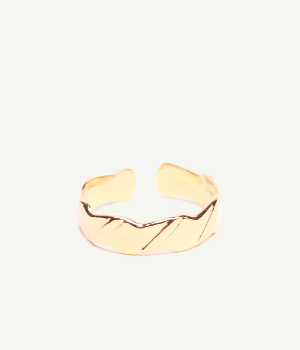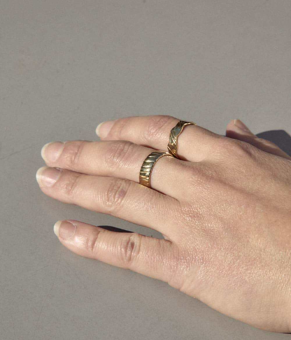 La bague Rachel est un anneau fin brillant ciselé avec de fines rayures. Minimale, intemporelle et unisexe, elle se porte facilement au quotidien, seule ou en accumulation.