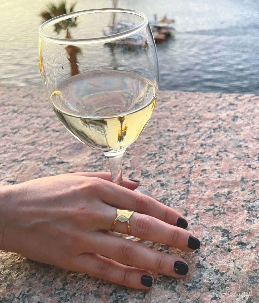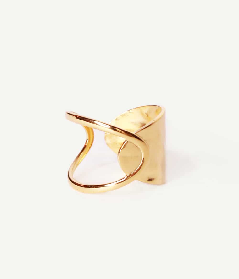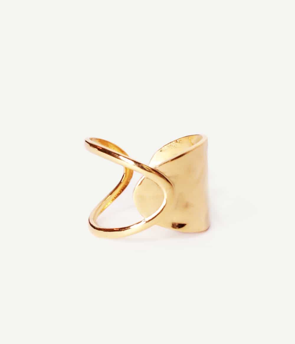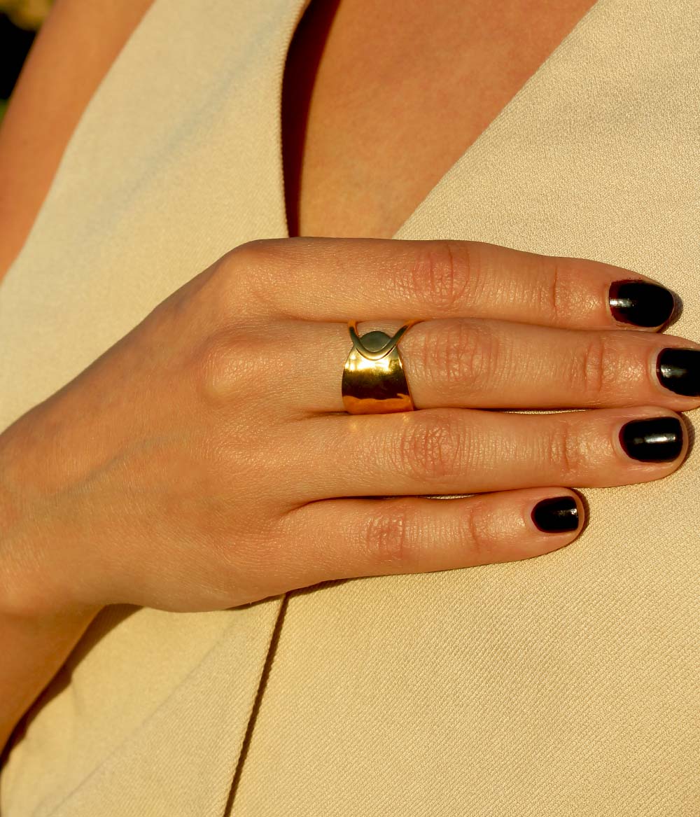 Nous avons choisi un design double face pour la bague Safiya – dont le nom signifie sagesse, opiniâtreté, pureté en égyptien – qui marie le plein et le vide. Son anneau large martelé permet au soleil de s’y refléter pour un look lumineux et stylé.