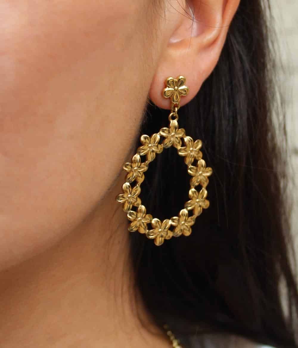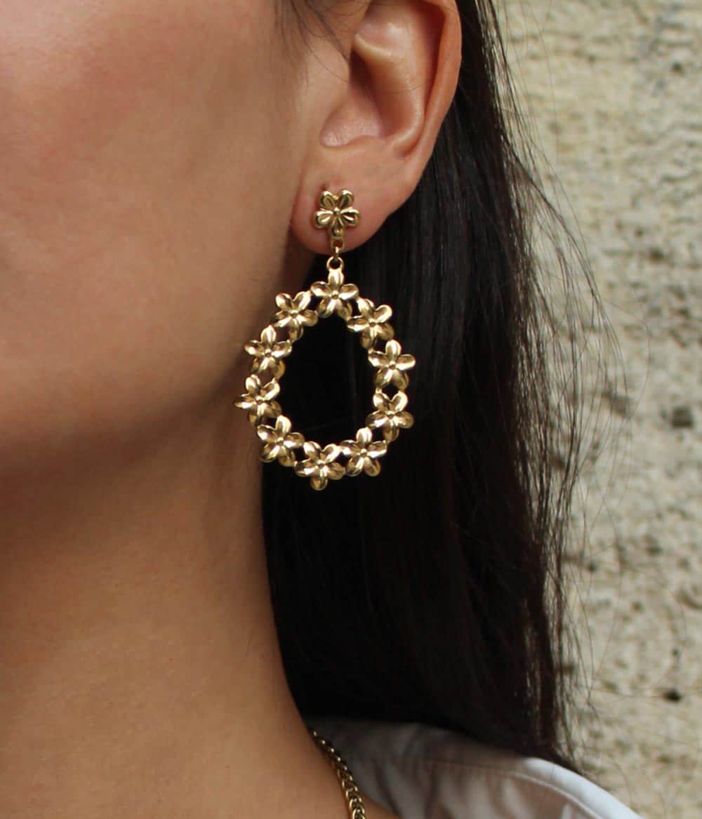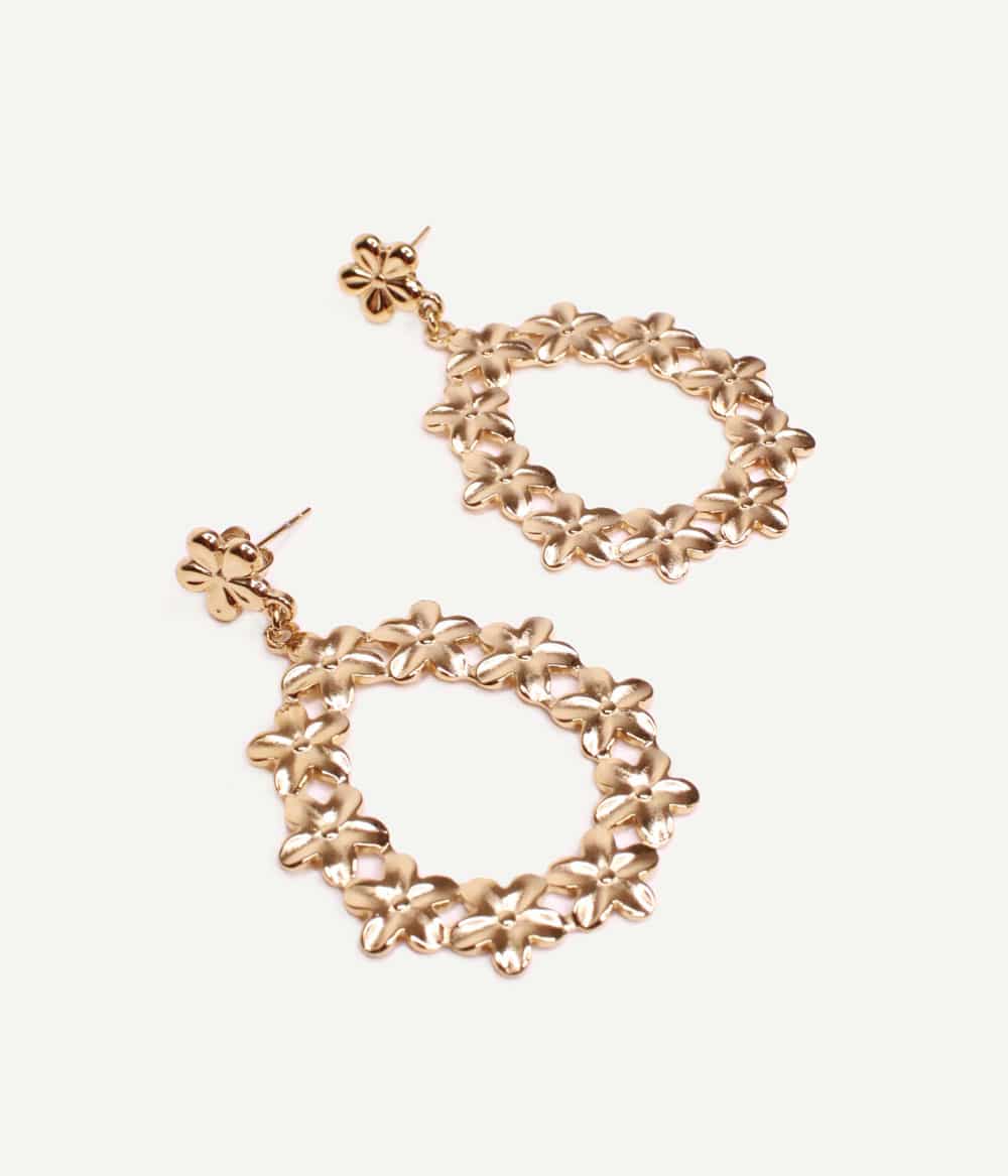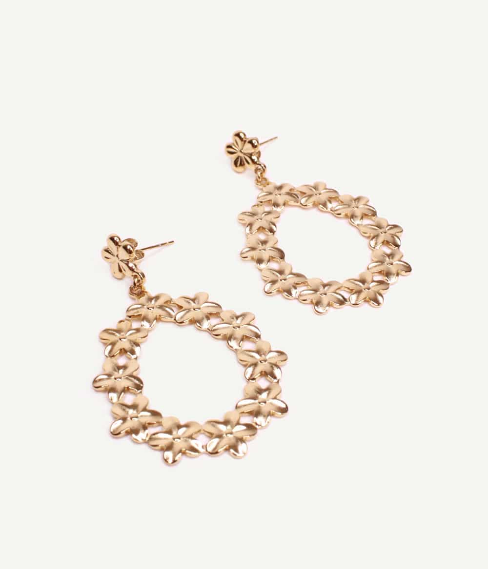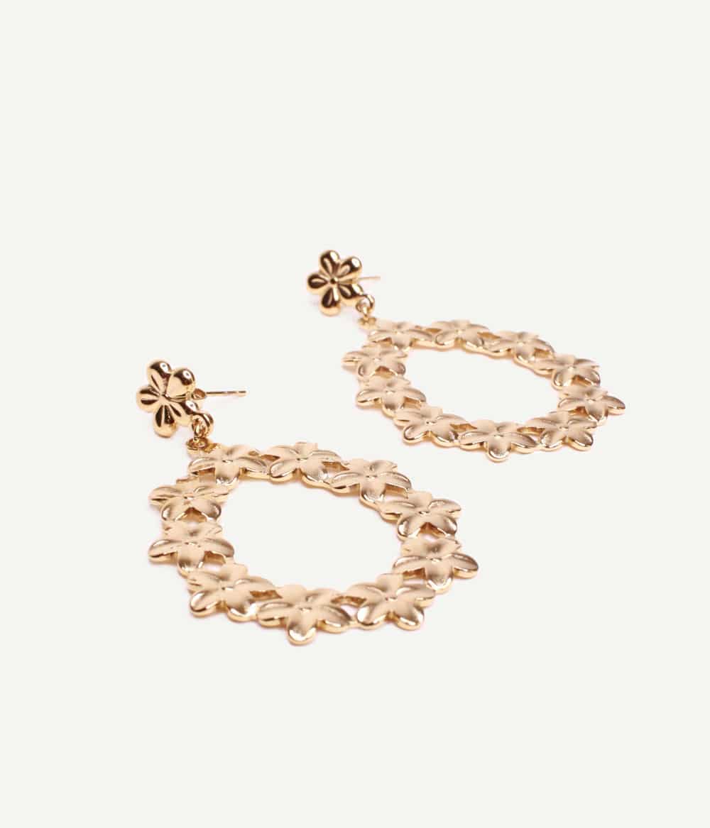 De jolies boucles d’oreilles dorées à pendants, gravées en forme de petites fleurs. Chic et originales, elles sublimeront vos looks d’été ou du soir avec leur touche seventies.