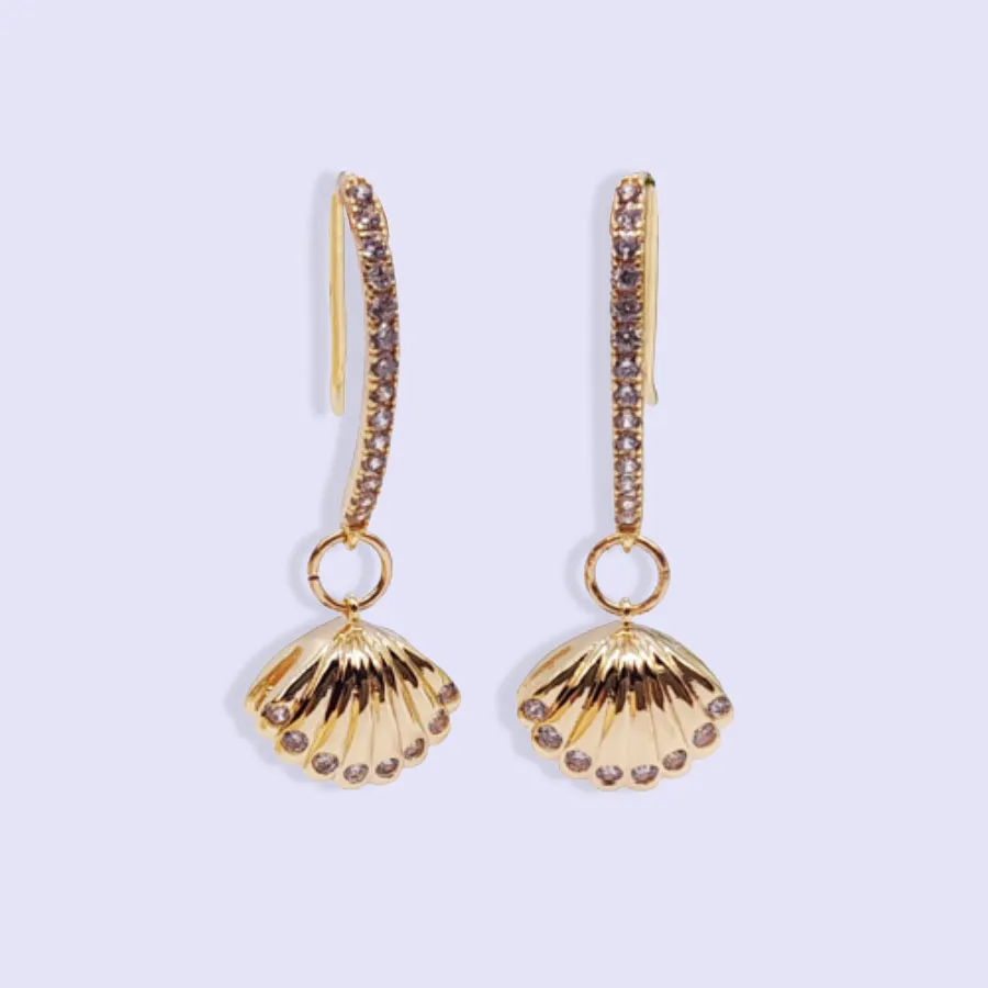 Boucles d’oreilles KORAYA PLAQUÉ OR, pendantes attaches crochets à breloques coquillages incrustées d’oxyde de zirconium, plaqué or PVD.