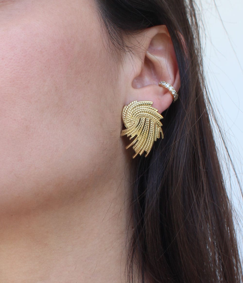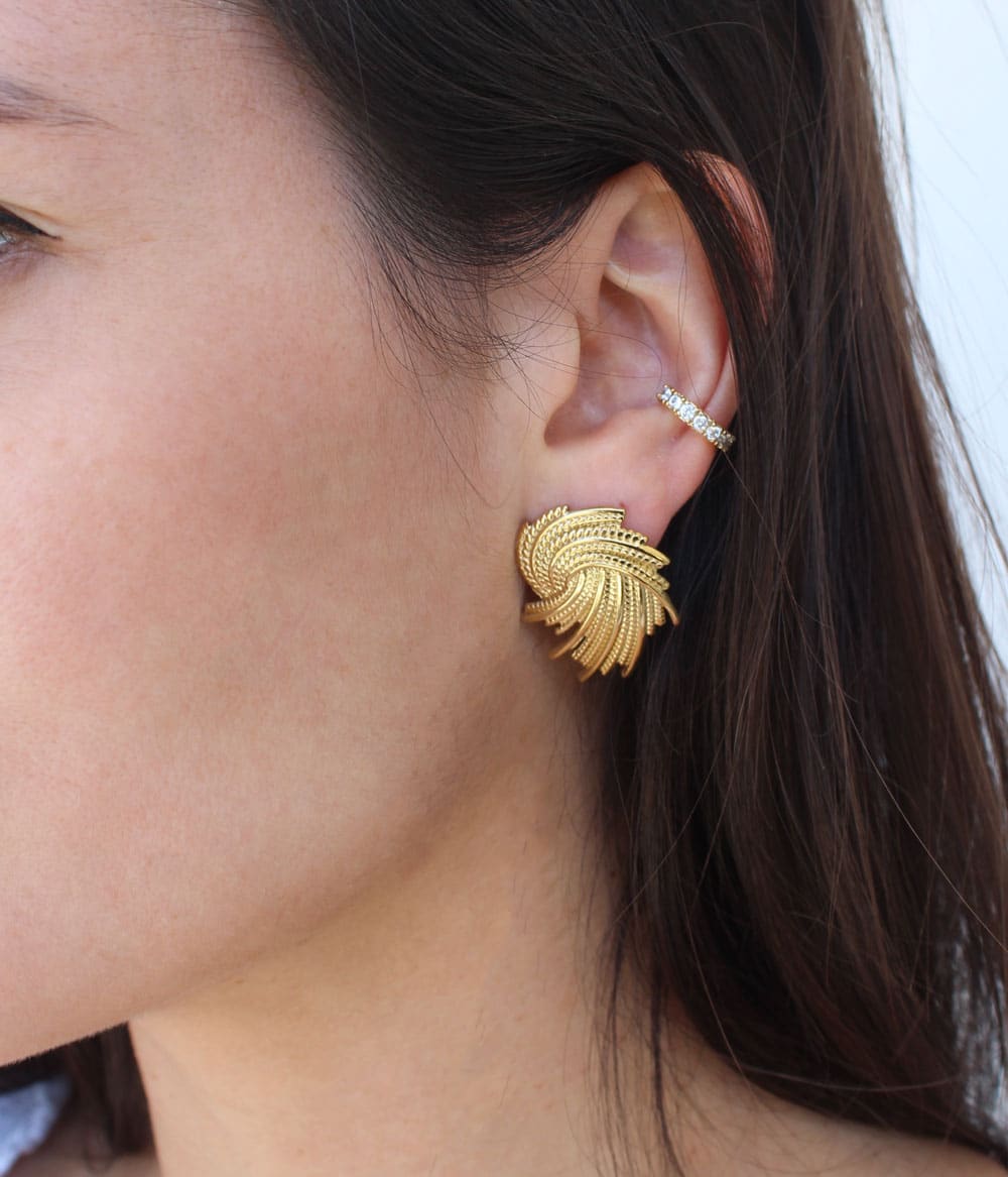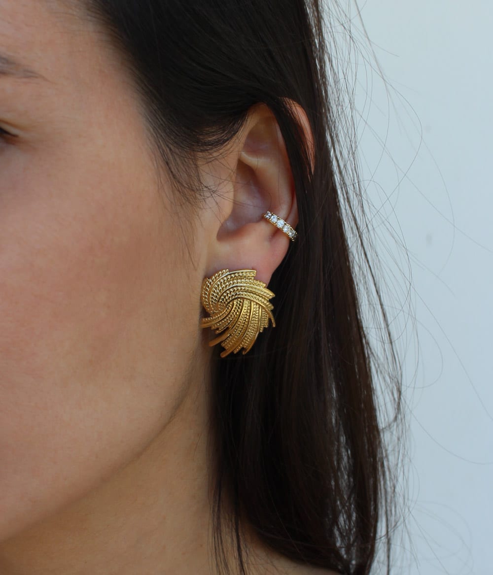 Avec leur silhouette fluide et légèrement ailée, les boucles Posada revisitent l’esprit vintage avec audace. Entre bijou rétro et sculpture dorée, elles encadrent le visage d’un éclat graphique et féminin, comme une paire d’ailes posée sur la peau.