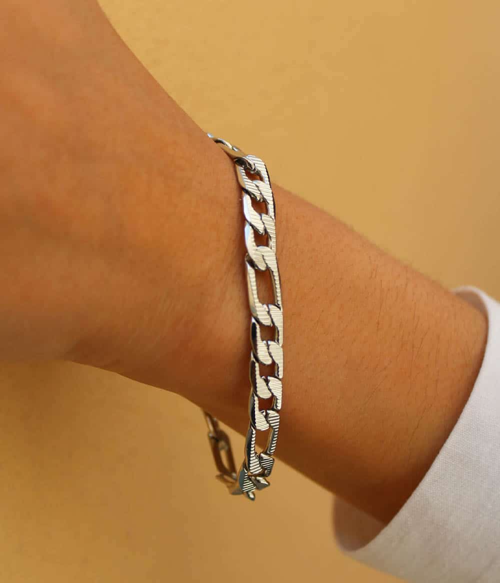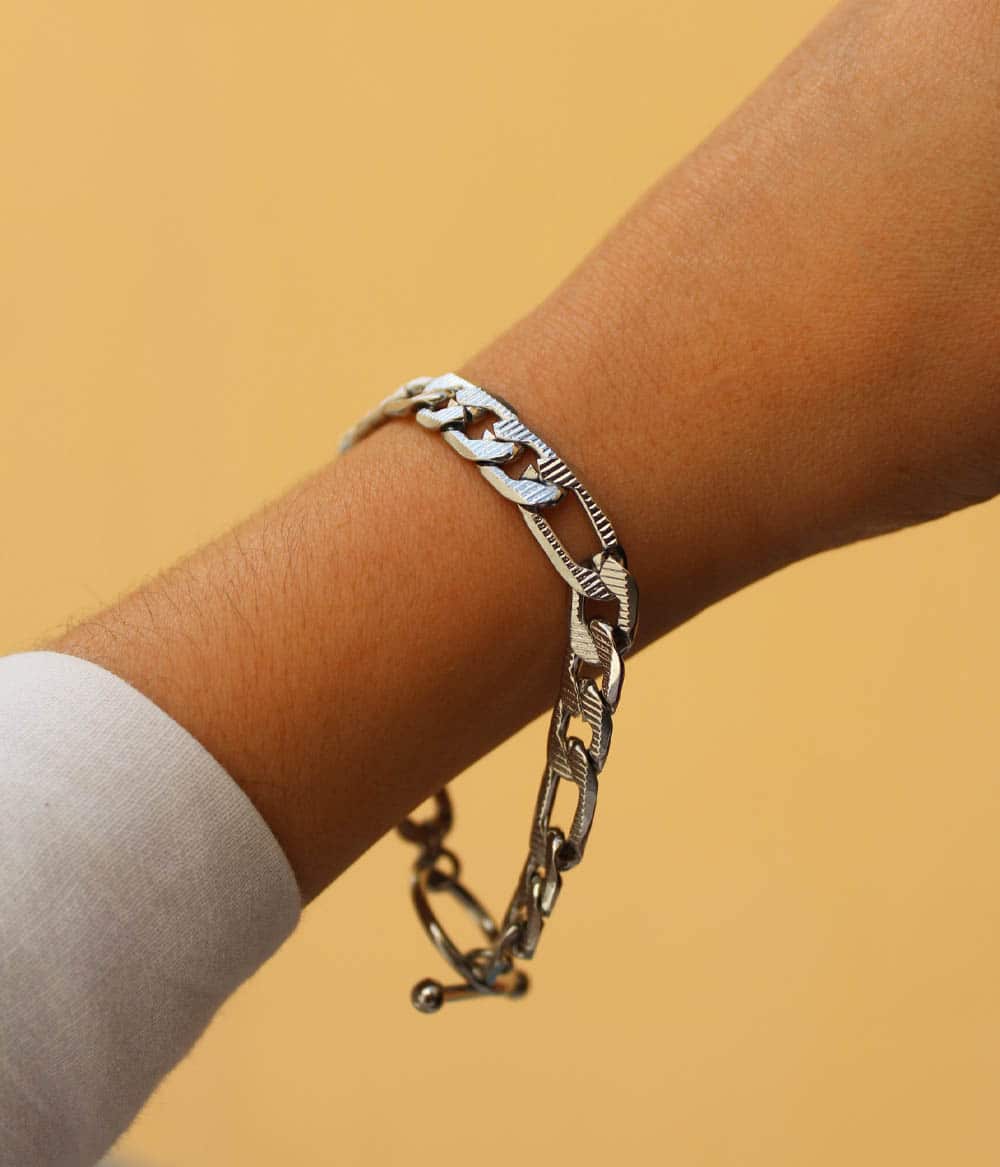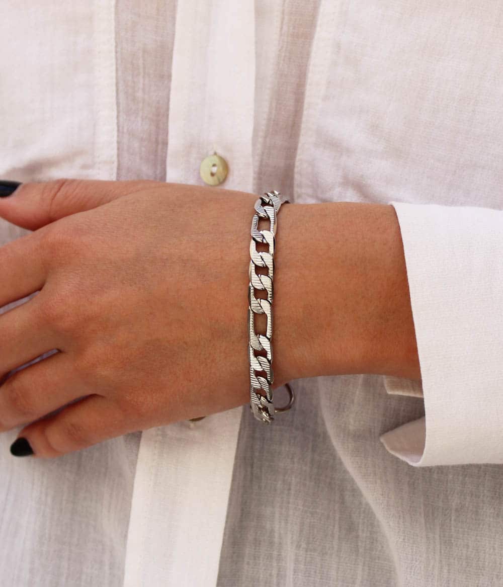 Un bracelet créateur à maille figaro, must have de la boite à bijoux, réapproprié ici avec son fermoir bâton pour une touche d’élégance intemporelle. Son aspect mat ciselé reflète joliment la lumière.