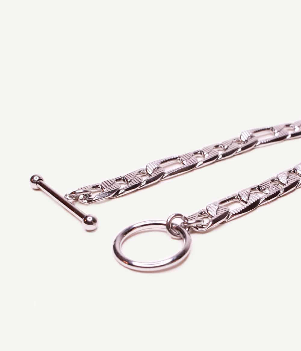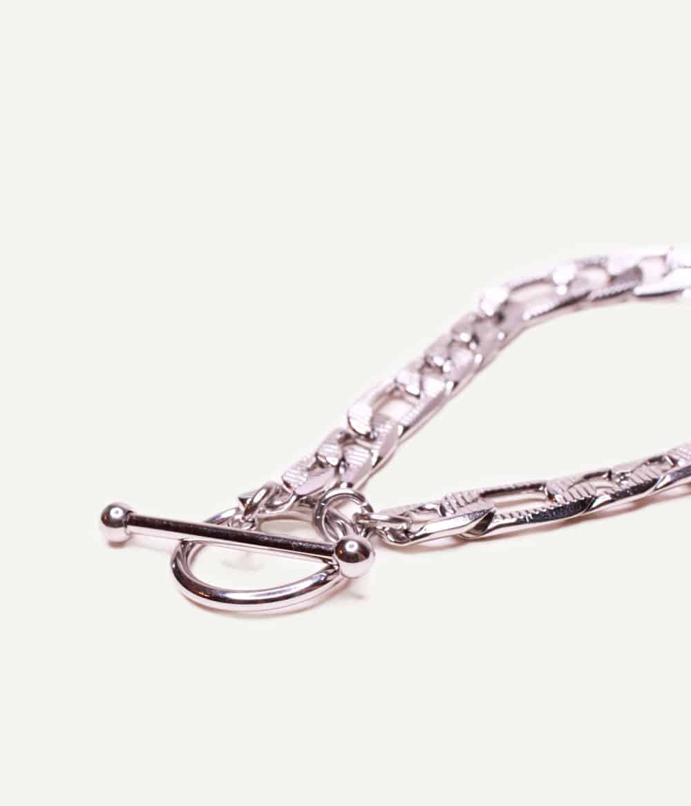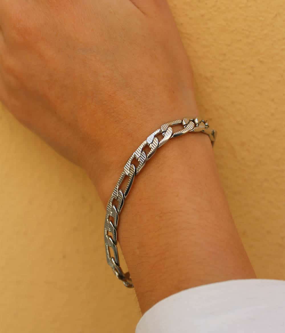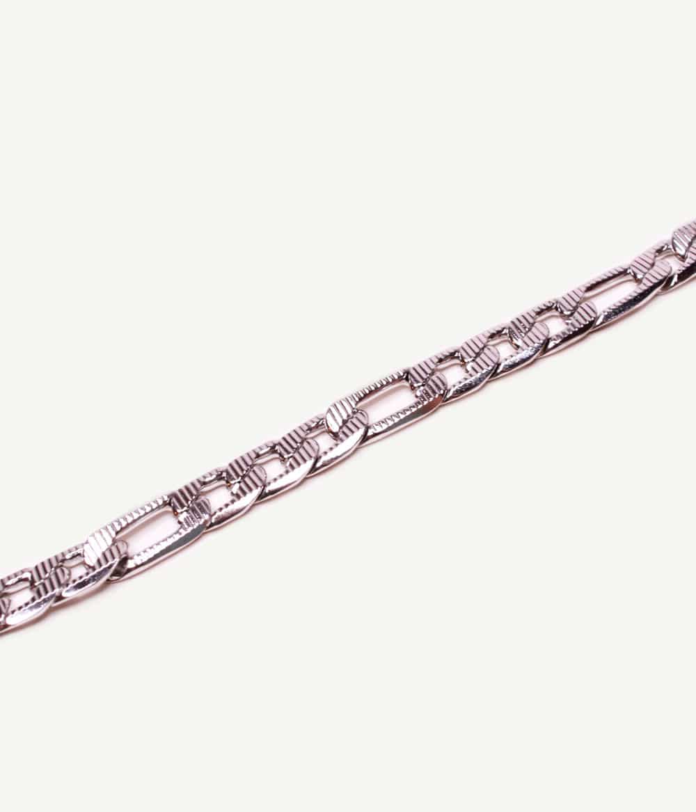 Un bracelet créateur à maille figaro, must have de la boite à bijoux, réapproprié ici avec son fermoir bâton pour une touche d’élégance intemporelle. Son aspect mat ciselé reflète joliment la lumière.