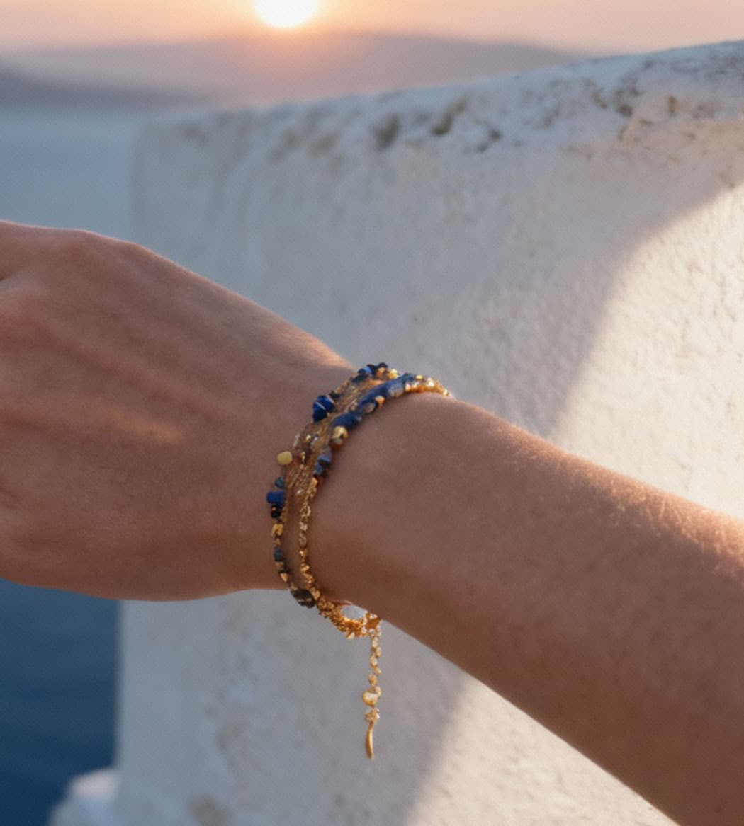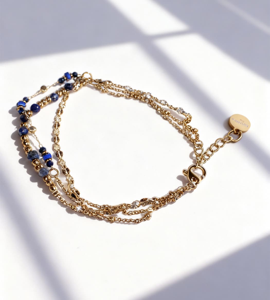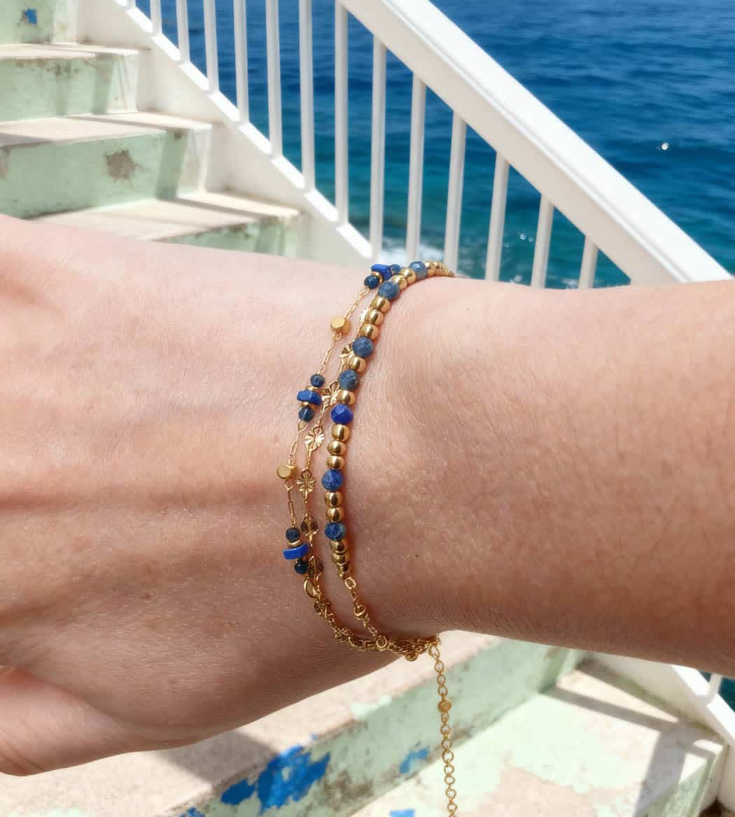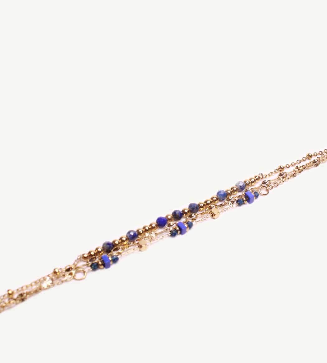 Bracelet multi-rangs doré mêlant chaînettes texturées et rangs de perles dorées et en pierres naturelles de lapis lazuli facettées. Ligne fine mais présente, pensée comme un stack prêt-à-porter. Souple et léger, il apporte une touche couleur marine au poignet.