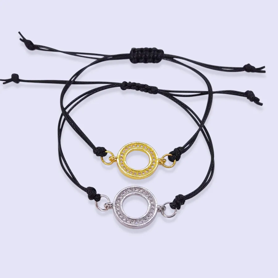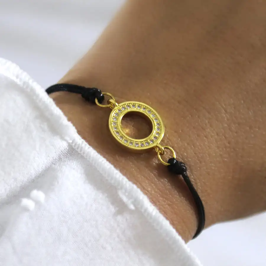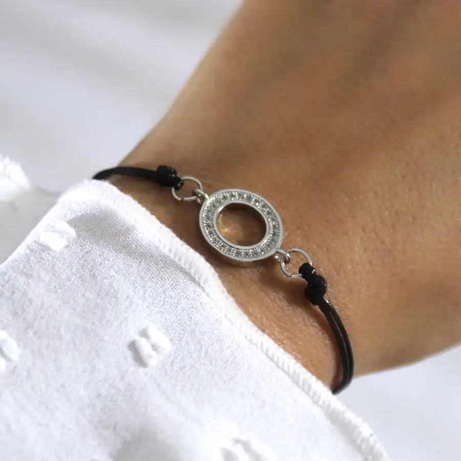 Bracelet CORDON CERCLE ZIRCONS, bracelet cordon ajustable et connecteur cercle en plaqué or PVD ou plaqué argent incrusté d’oxydes de zirconium. Disponible en 16 couleurs de cordon.