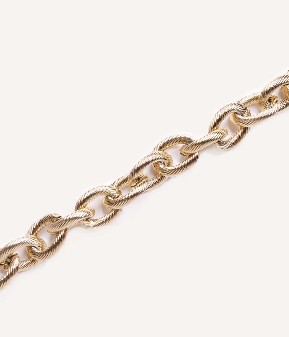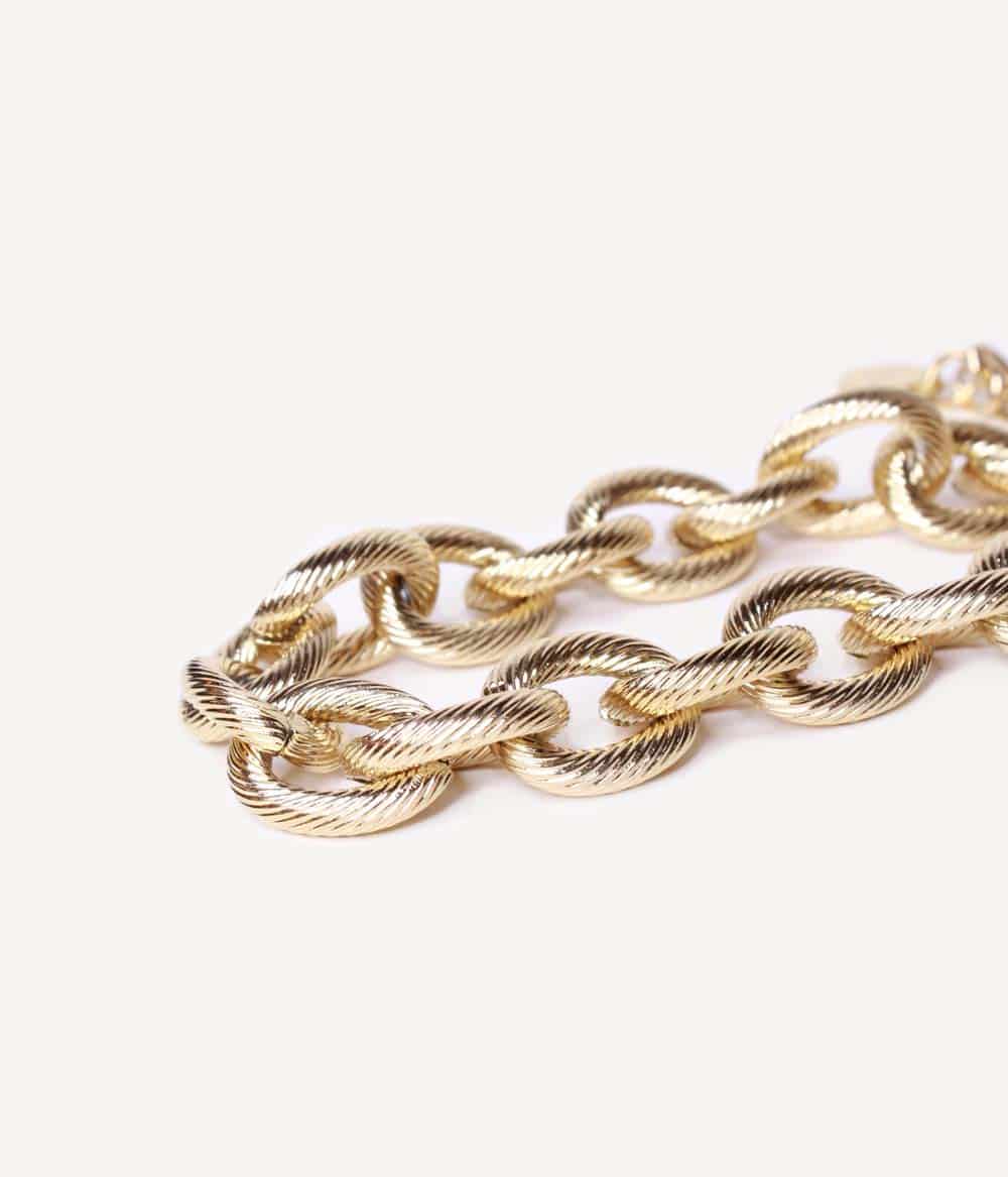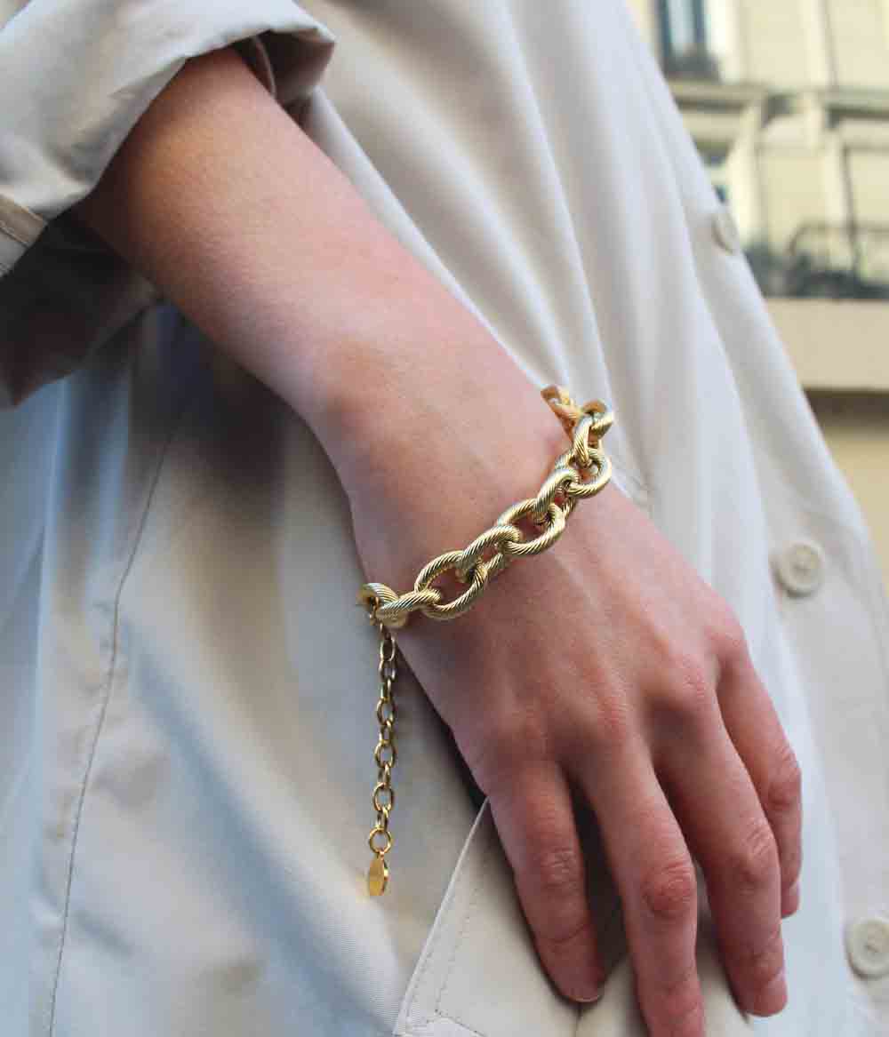 Un bracelet chaîne extralarge à la maille dorée, massive et ciselée, façon bijou vintage. Se porte loose sur le poignet.
