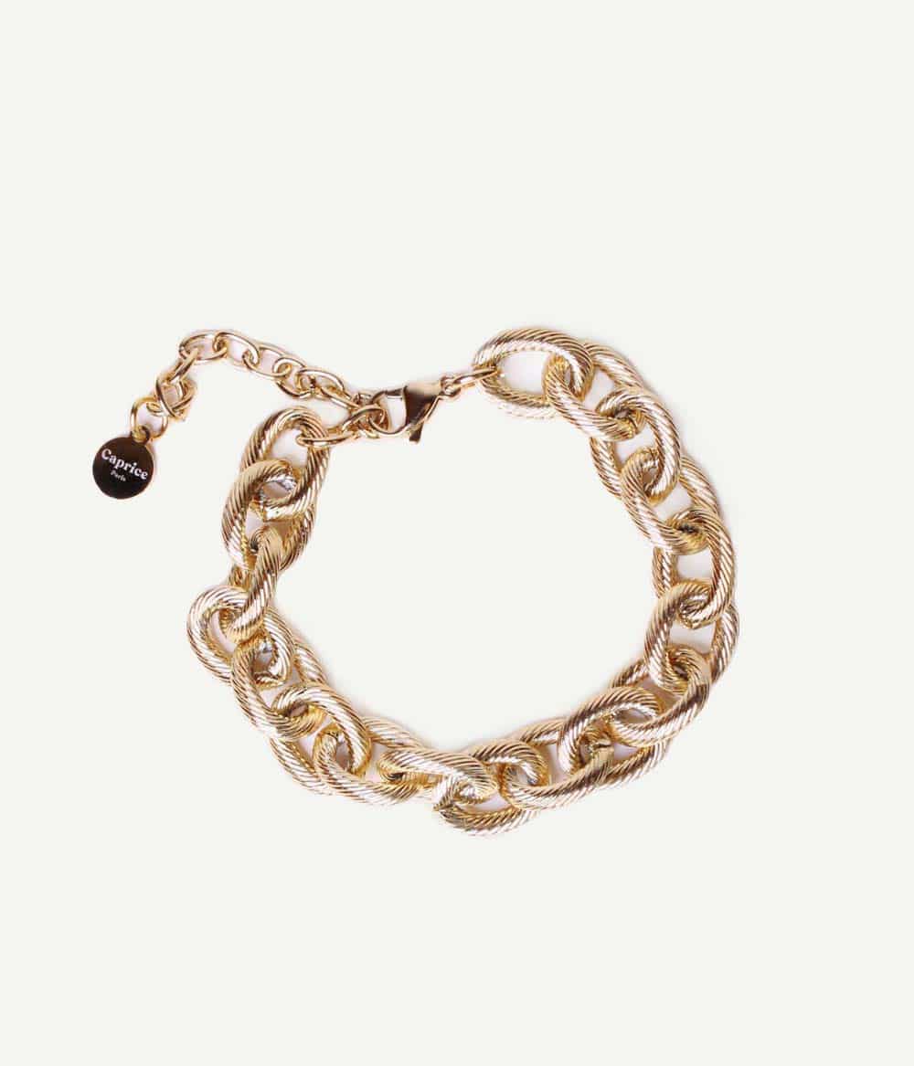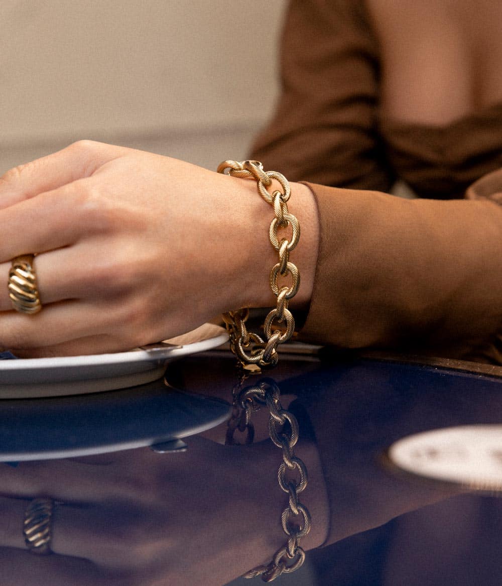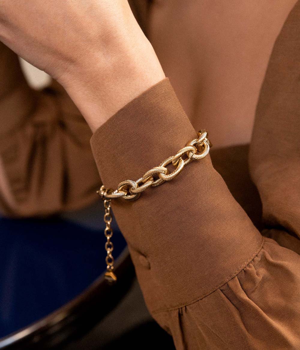 Un bracelet chaîne extralarge à la maille dorée, massive et ciselée, façon bijou vintage. Se porte loose sur le poignet.