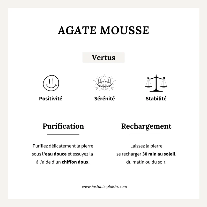 POSITIVITÉ : Cette jolie pierre verte est une pierre à caractère bienveillant et positif. Apaisante, l’agate mousse permet une meilleure estime de soi mais également de recentrer ses pensées de façon plus positive.