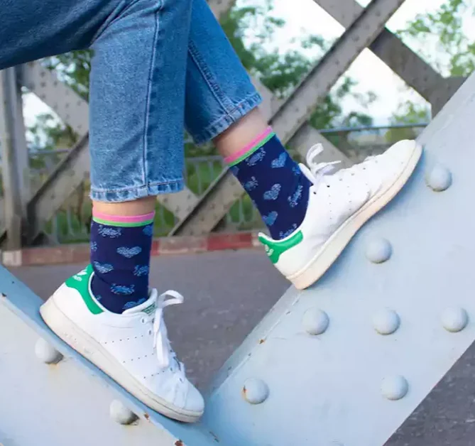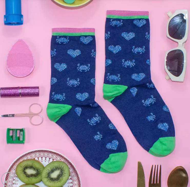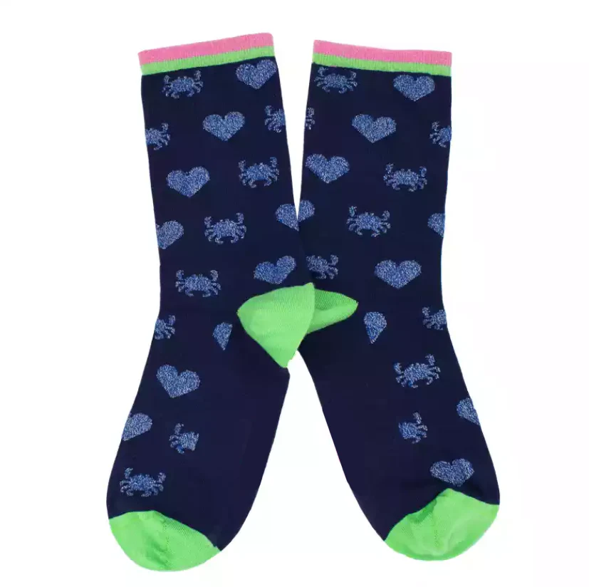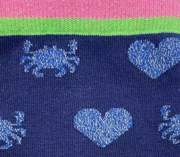 Jolies chaussettes à motifs petits crabes et cœurs bleu pailletés !