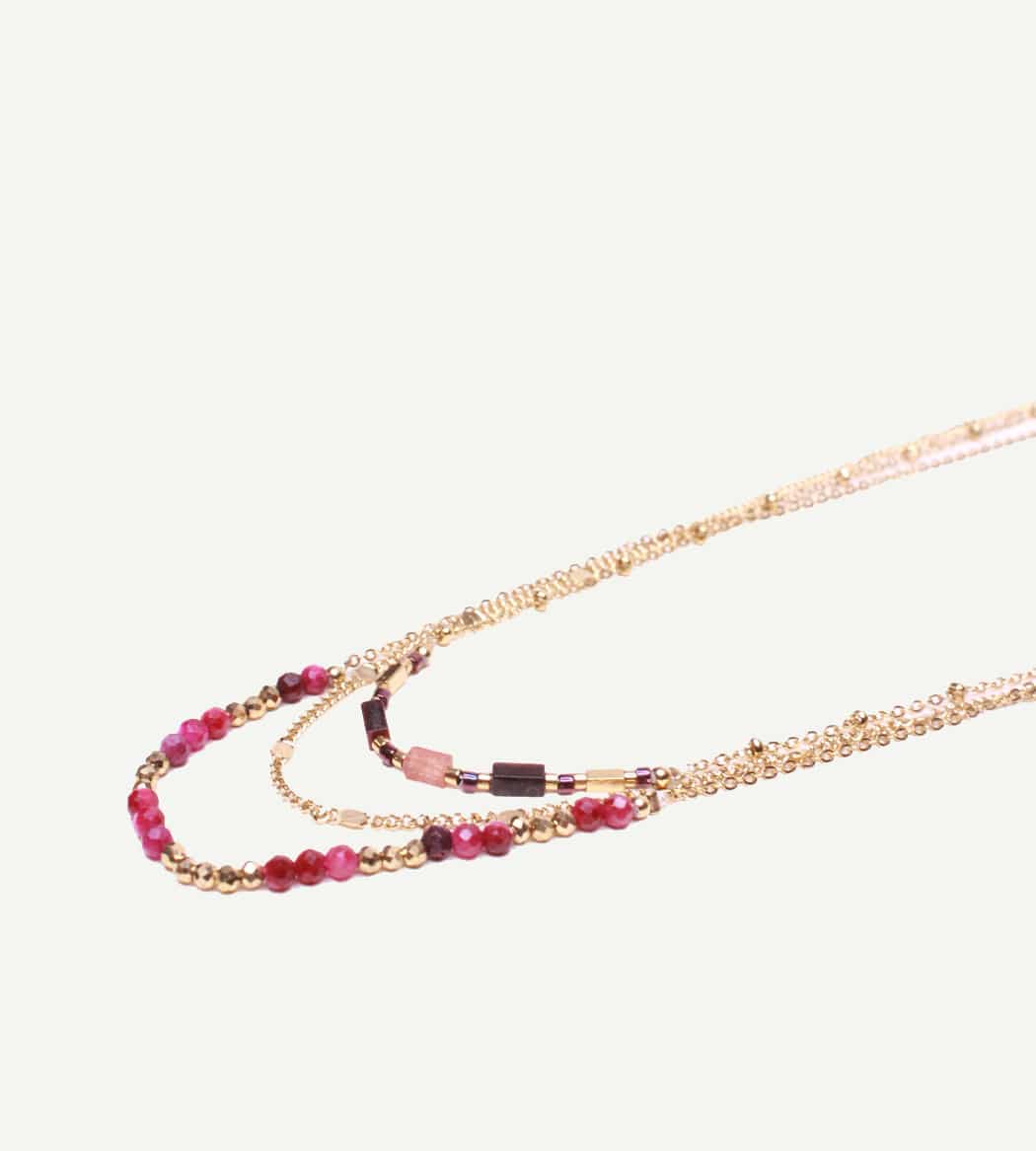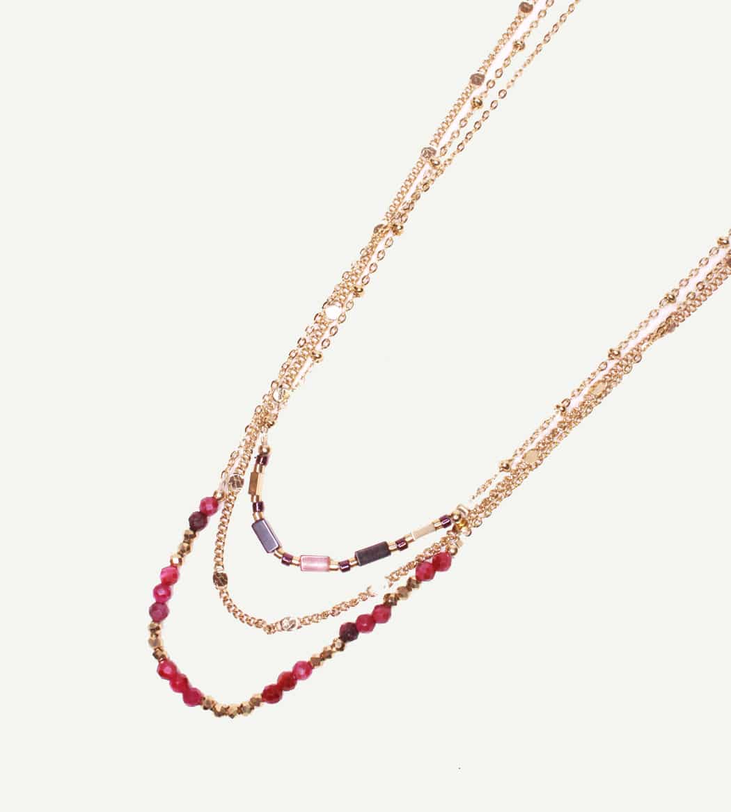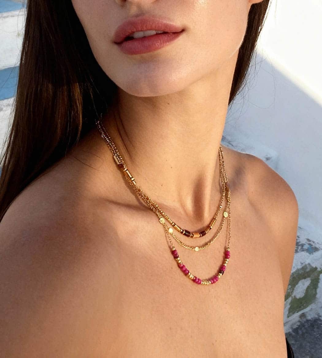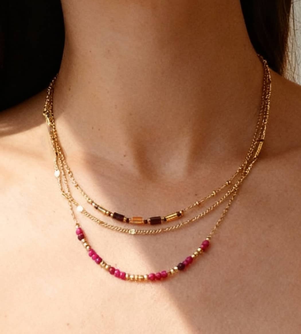 Ce collier multi-rangs installe d’emblée le layering que l’on cherche toutes : une maille dorée qui structure, un rang chaud façon ambre qui apporte la profondeur, puis une ligne de perles framboise pour le flash couleur. Le résultat est net, lumineux, ultra-portable — le bon équilibre entre chic et décontraction.