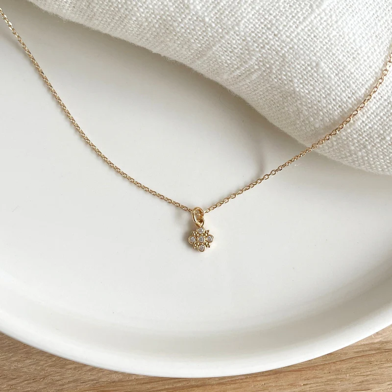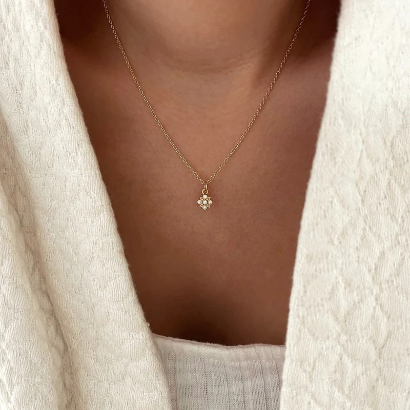 • Petit pendentif orné d’oxydes de zirconium (diamètre : 0,7cm) monté sur une chaîne fine