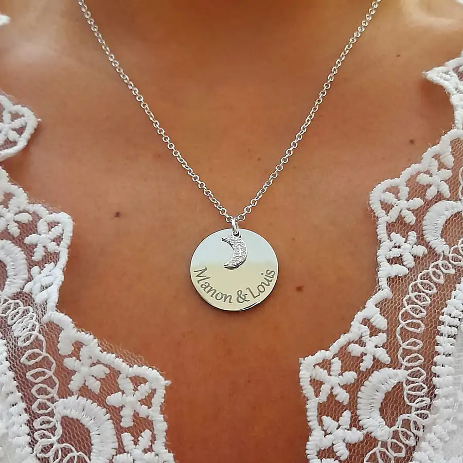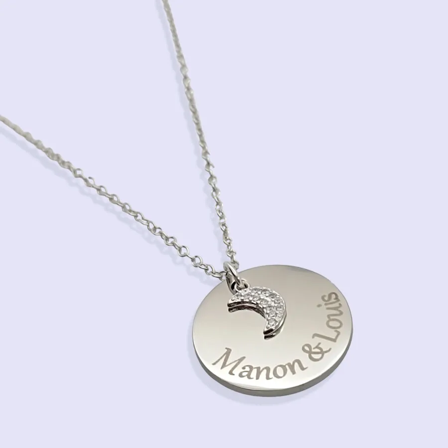 Collier GRAVÉ ARGENT LUNE, argent 925, chaîne forçat et médaille 2 cm personnalisable avec gravure texte incurvé + pendentif lune à zircons.