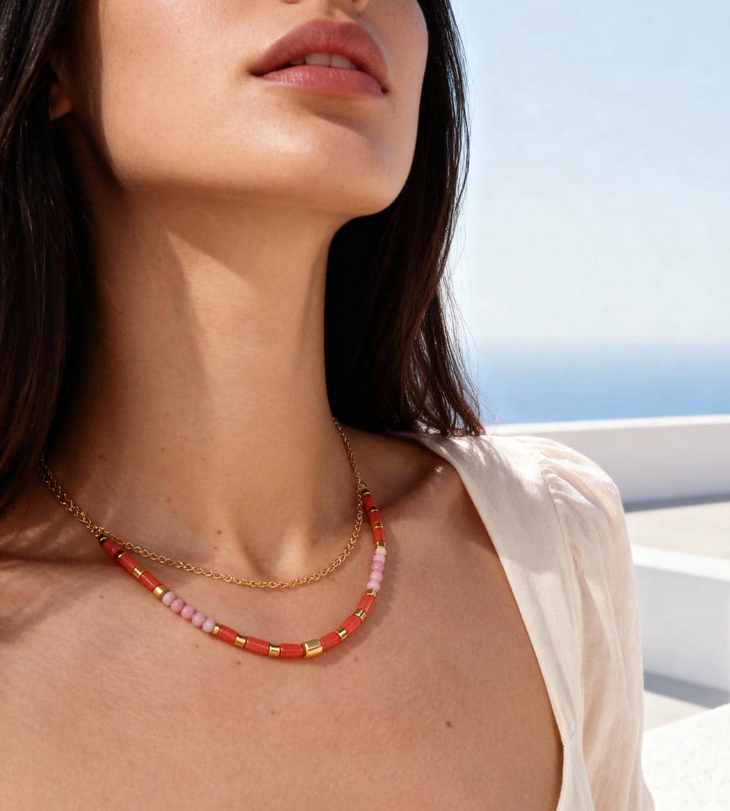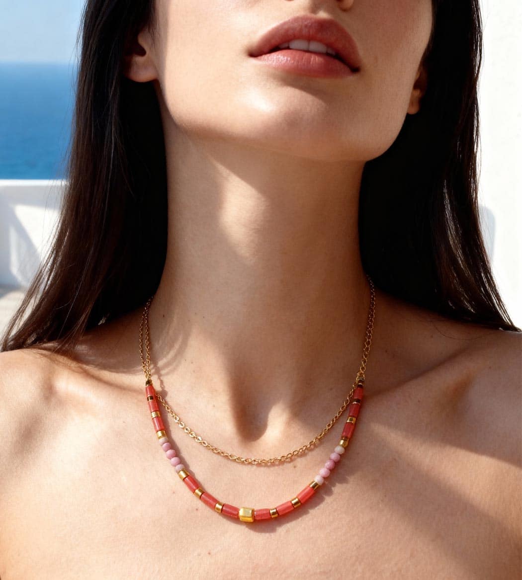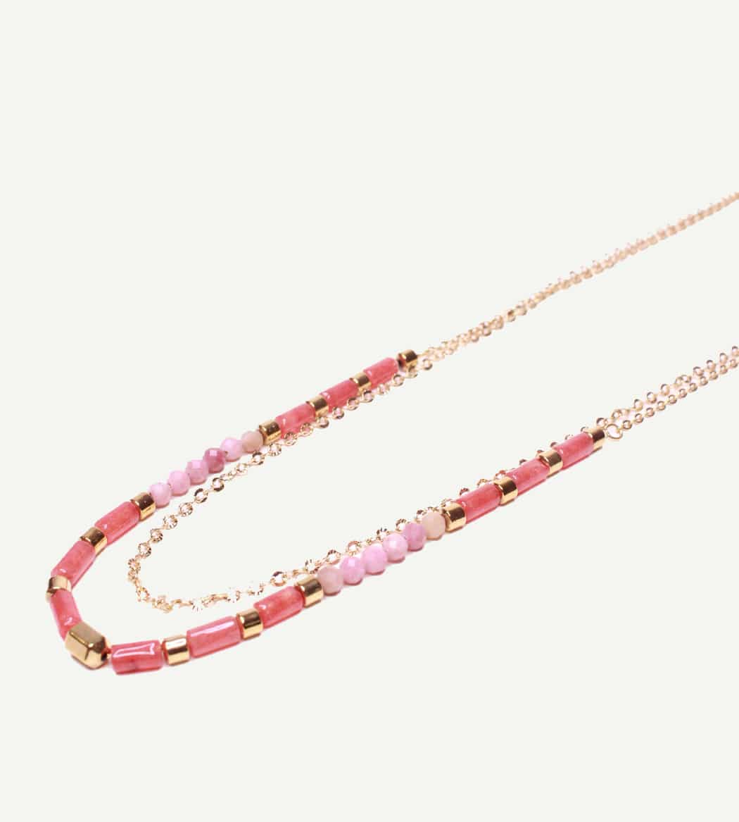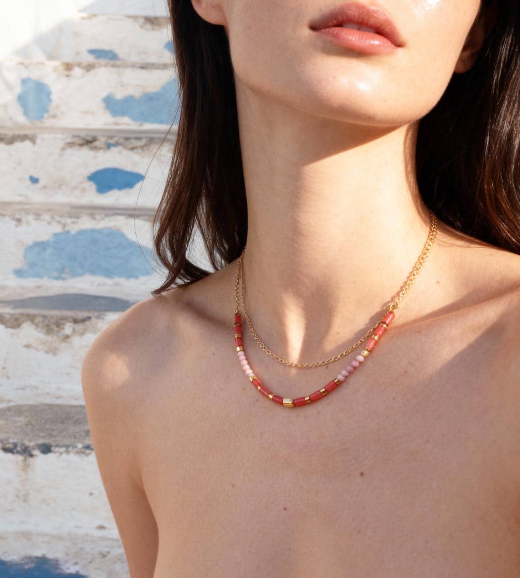 Collier double rang pensé pour structurer l’encolure : une chaîne dorée fine et un rang de perles roses tendre et d’intercalaires métalliques polis. Le mix joue le color-blocking et le contraste mat/brillant pour un résultat net, contemporain. Portez-le seul pour signer un look minimal avec une touche couleur, ou en layering avec une chaîne plus longue.