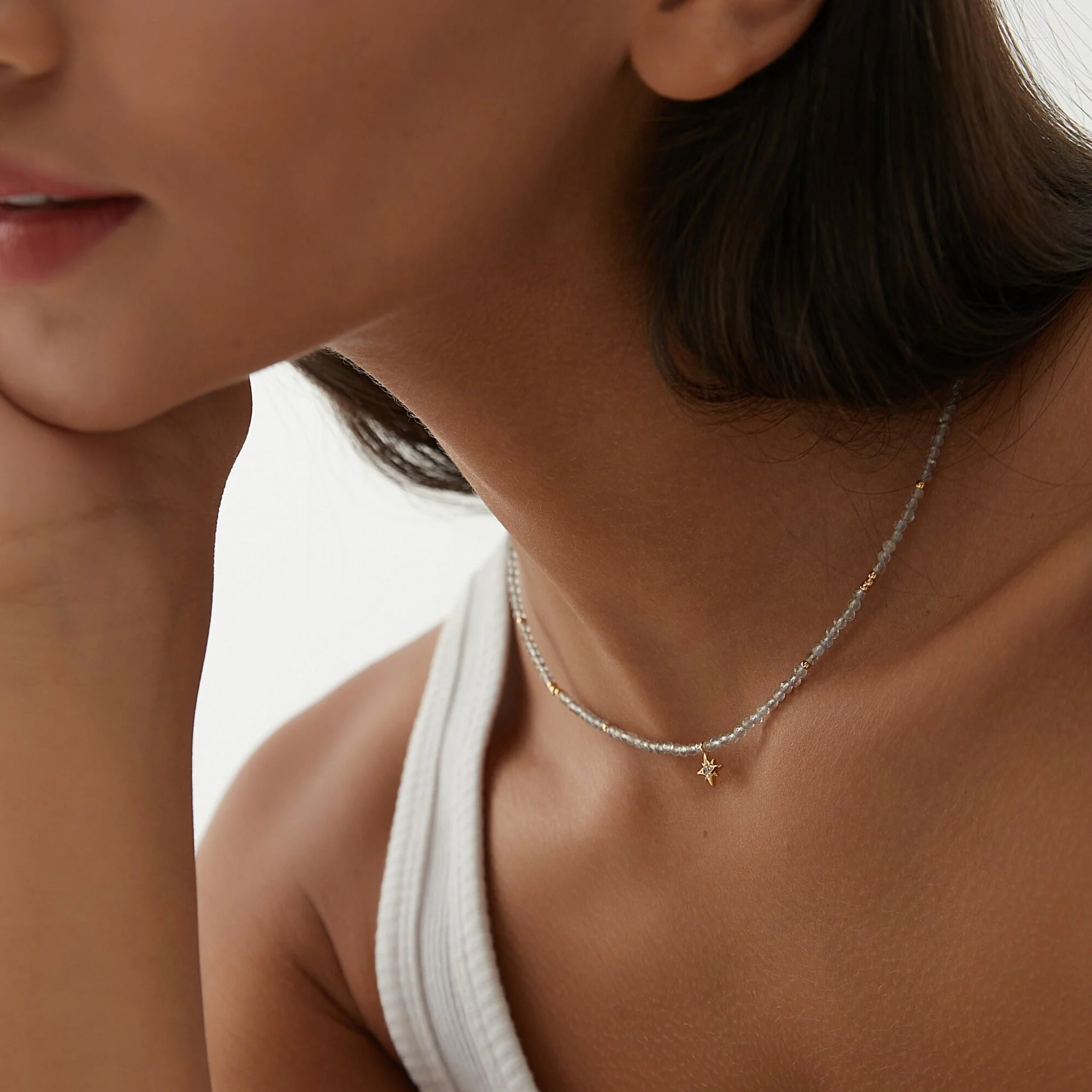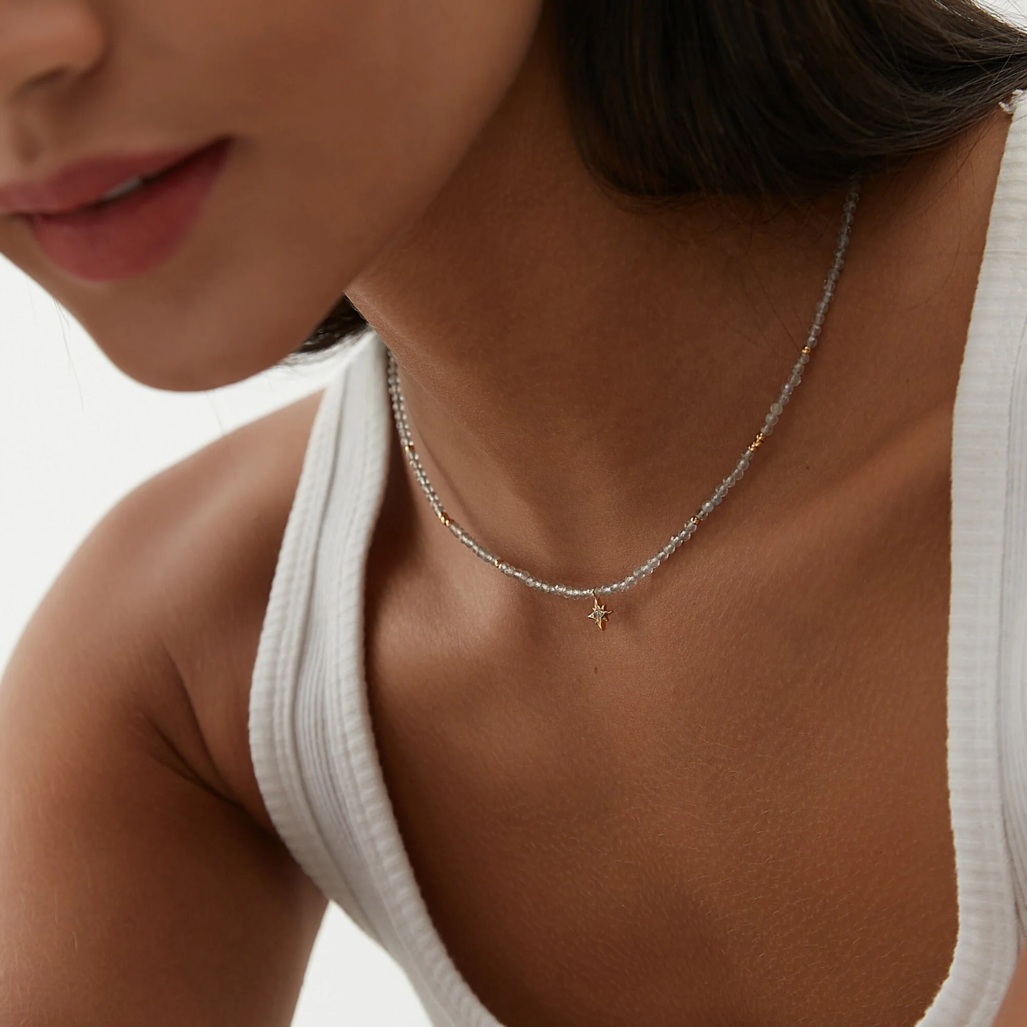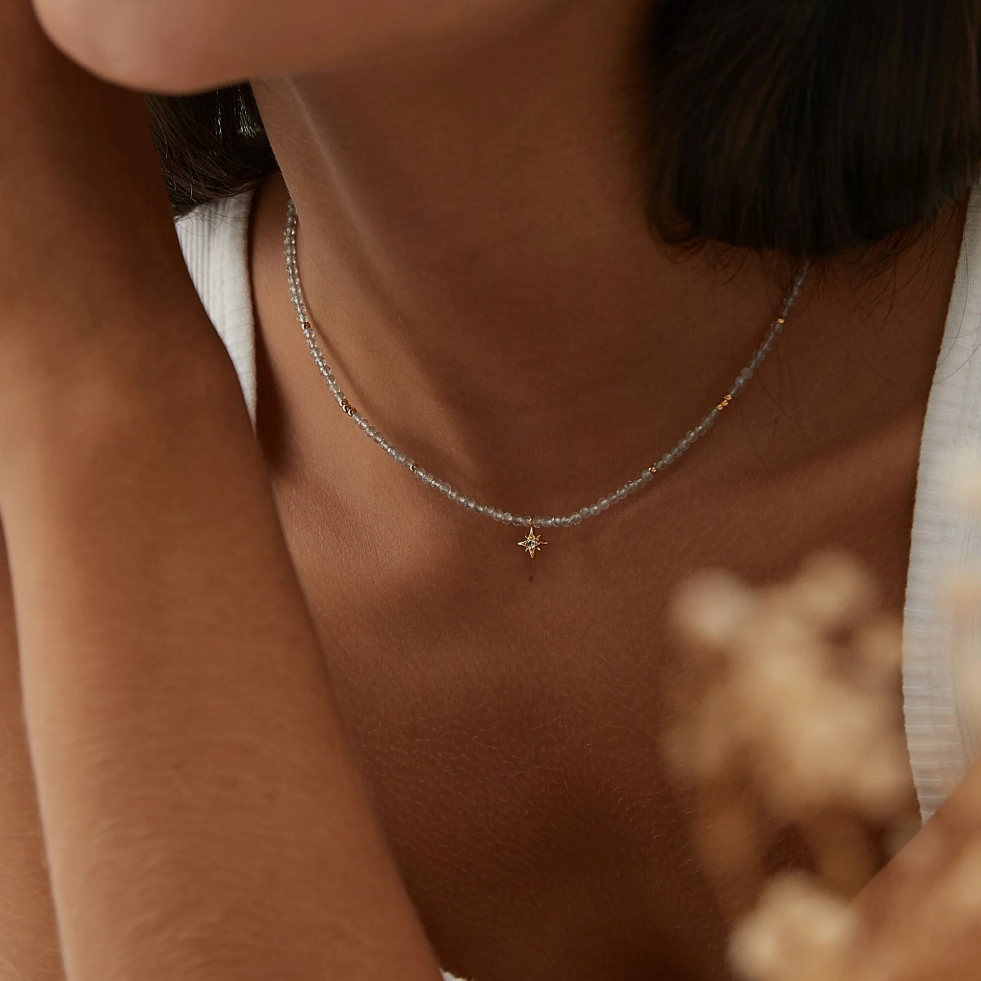 Élégant collier composé des billes en pierre de lune avec pendentif étoile du nord , Bijou tendance à porter tous les jours, seul ou en accumulation avec d’autres colliers et Idéal pour offrir le cadeau Saint-Valentin pour elle.
