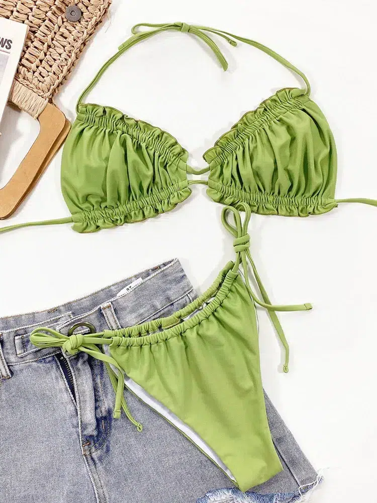 Conçu pour épouser harmonieusement vos courbes, ce bikini met en valeur votre silhouette grâce à son haut en triangle avec fronces et son bas échancré à nouer sur les côtés.