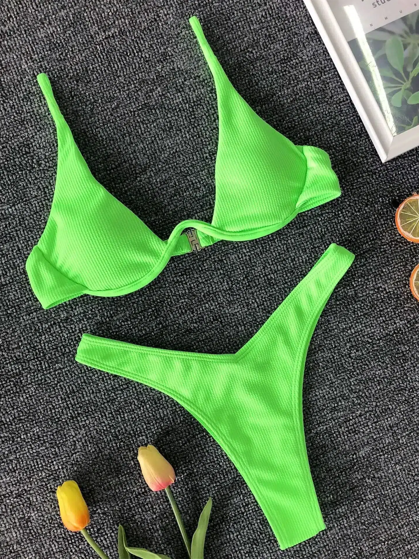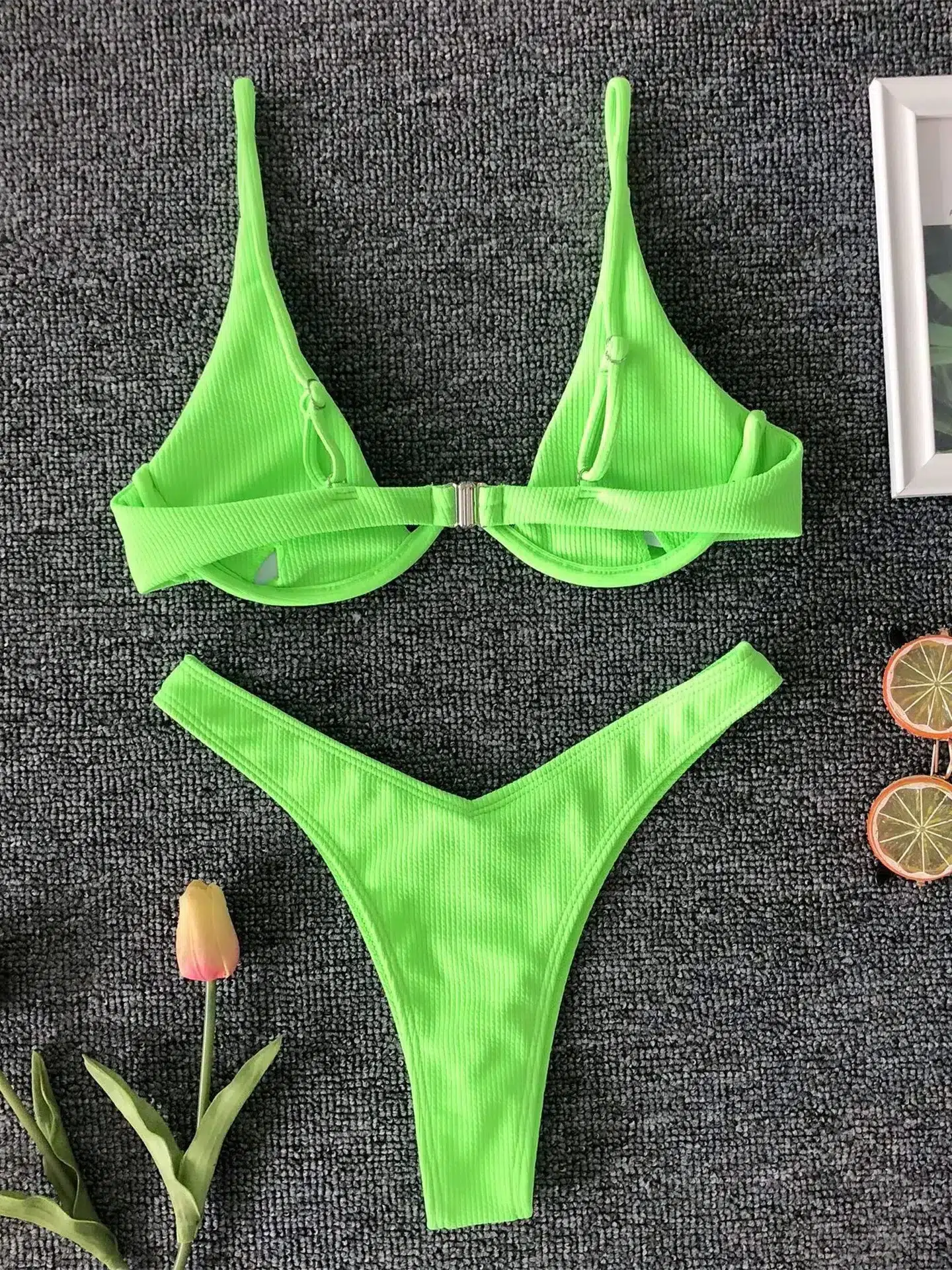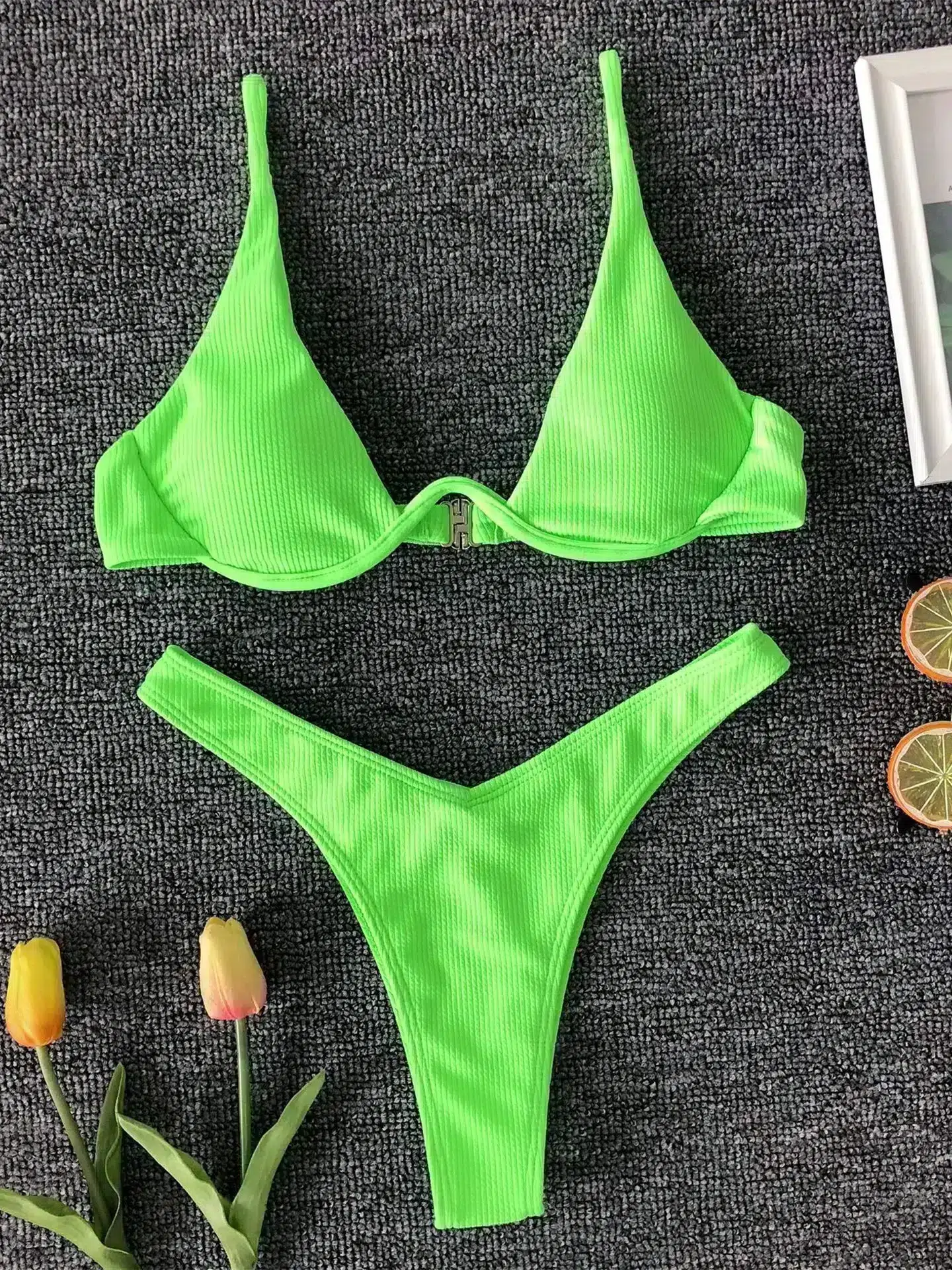 Avec son éclat vert fluo, ce bikini moderne vous offre non seulement un style audacieux, mais aussi un confort inégalé grâce à son haut triangle à bretelles fines qui sublime délicatement votre silhouette.