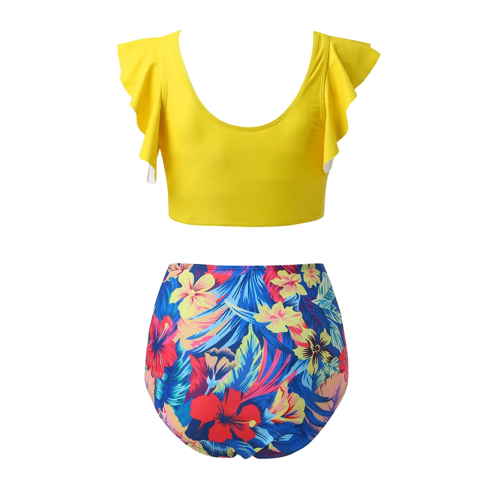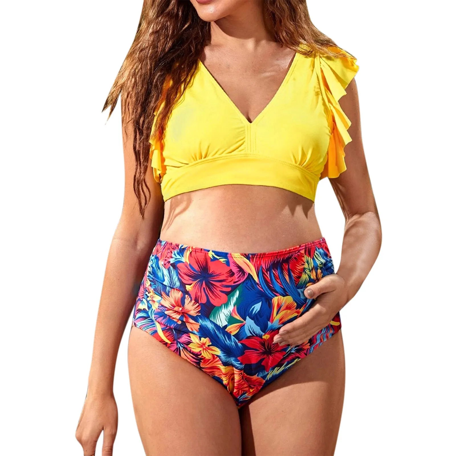 Le haut jaune vif, orné de volants délicats sur les épaules, apporte une touche de féminité et de sérénité, tandis que le décolleté en V souligne gracieusement votre silhouette. Le bas taille haute, orné d’un magnifique motif floral tropical, infuse un esprit joyeux à vos sorties à la plage ou à la piscine.
