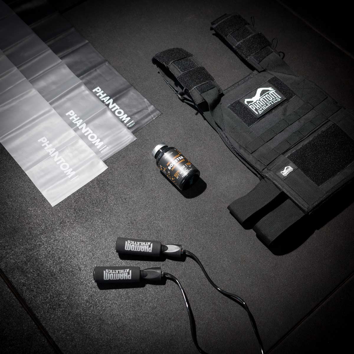 Das Phantom Trainingswesten Set: Hol das Maximum aus deiner Trainingsweste und starte direkt mit dem Tactic Springseil, dem Resistance Band Set sowie dem Performance Booster in dein neues Workout.